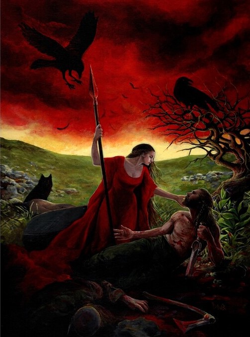 Badb: al igual que Morrigan se dice que volaba sobre el campo de batalla en forma de cuervo, alentando a los guerreros a que fueran los mejores. Cuando acababa la batalla se detenía a contemplar a los que yacían e incluso palpaba su sangre. Es quizás la más sangrienta de la triada, ya que en el mito sobre la muerte del guerrero Cornac se dice que “Badb, la de la boca ensangrentada irá dando gritos…buscando afanosamente cadáveres”