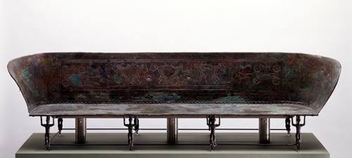 El banco de bronce es el único que se ha encontrado en este contexto. Se podía mover gracias a 8 ruedas, que sirven como monociclos a ocho figuras portadoras, que sabemos que son mujeres porque llevan los pechos al descubierto. En el centro del respaldo se encuentran tres parejas de luchadores que parecen bailar, portando la espada en su mano trasera.