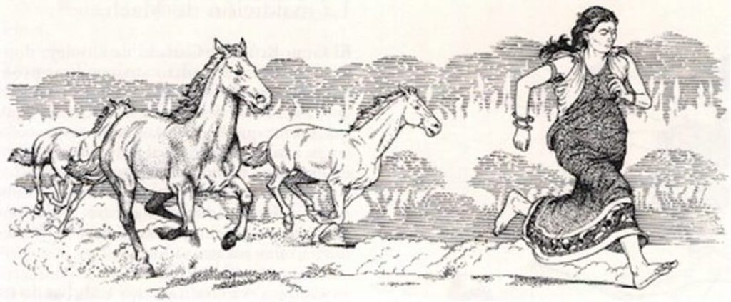 Crunnchu era un rico campesino que, un día, estando solo en su casa de pronto entró una preciosa doncella la cual se puso a hacer las labores del hogar. Sin pronunciar palabra atendió las labores domésticas y al ganado, sirvió la comida al hombre…todo bajo el silencio más absoluto. Después de esto se metió en la cama con Crunnchu con quien hizo el amor, quedando embarazada, y desde ese momento en aquel hogar la riqueza creció y ambos gozaron de bienestar y prosperidad.