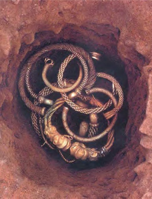 Y ahora vamos a ver torques encontrados, aunque muchos se han encontrado en piezas, otros se han encontrado completos. Aquí un depósito de torques en Snettisham (Gran Bretaña)