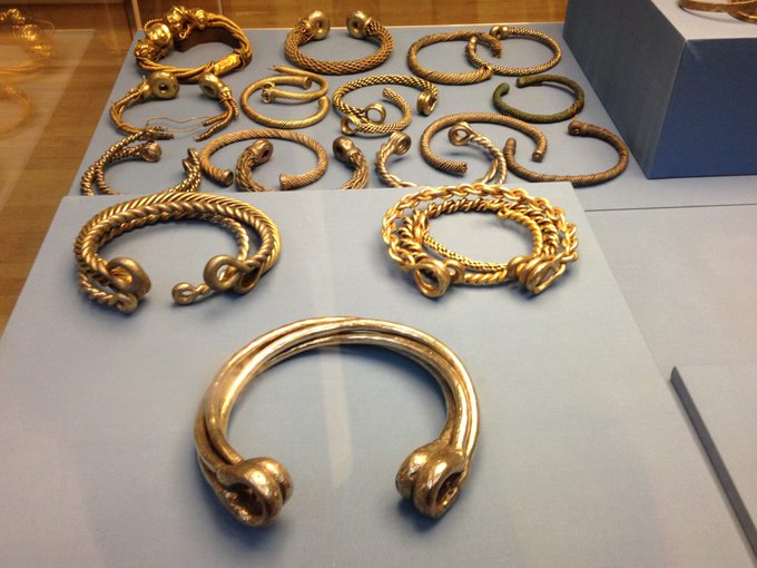 Veamos algunos de cerca. Este, el conocido como Torque de Snettisham consta de 64 hilos entrelazados y pesa poco más de un kilo. Está realizado en oro y plata. Su datación es del 150 al 50 a.C, siendo descubierto en 1950