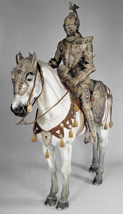 Comencemos por una de mis favoritas, la armadura ceremonial de Enrique III (Francia) y fechada entre 1575-1580. Sufrió graves daños en un incendio haciendo que perdiera el dorado que la cubría y perdiéndose las defensas de los brazos.