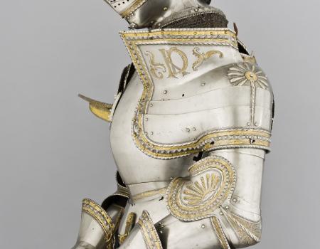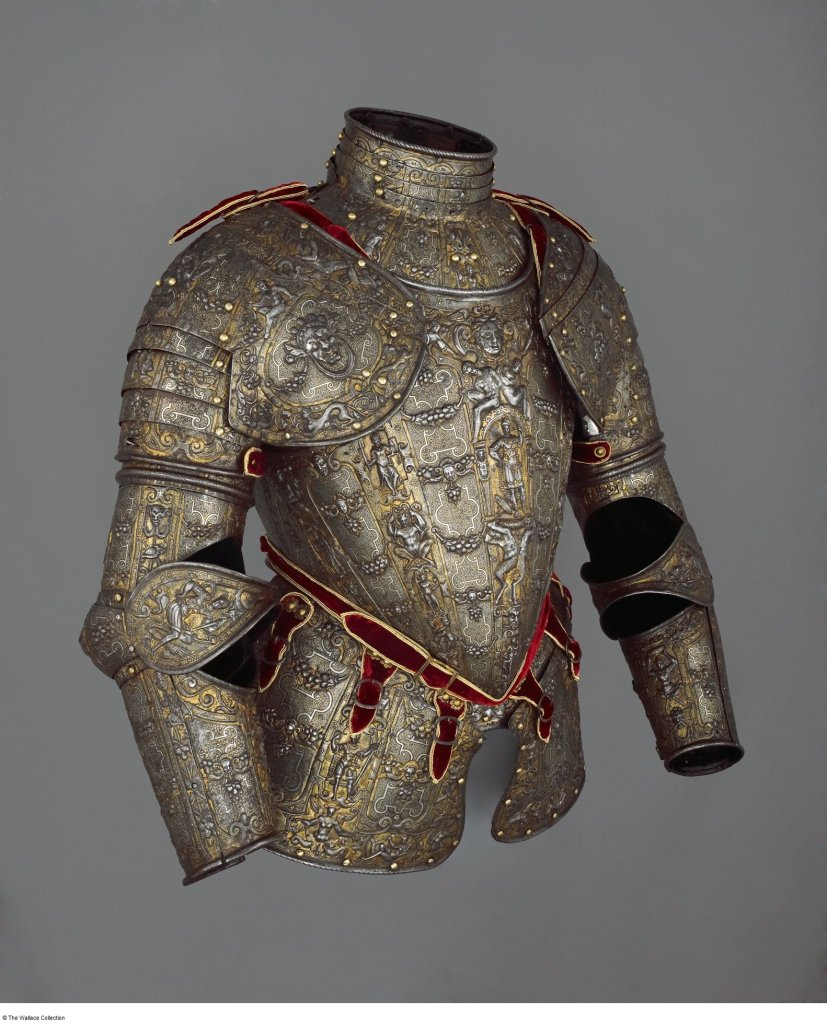 Armadura parcial de Alfonso II, duque de Ferrara. Realizada por Lucio Marliani (conocido como Piccinino)entre 1575-1590, en Milán (Italia). Sus materiales son el oro, plata, cuero y textiles.