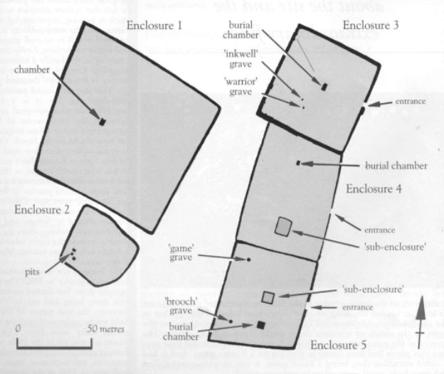 El yacimiento se compone de una serie de recintos, en los que una personalidad importante fue enterrado en una cámara central y a su alrededor se encontraban una serie de cámaras de personas cercanas a este.