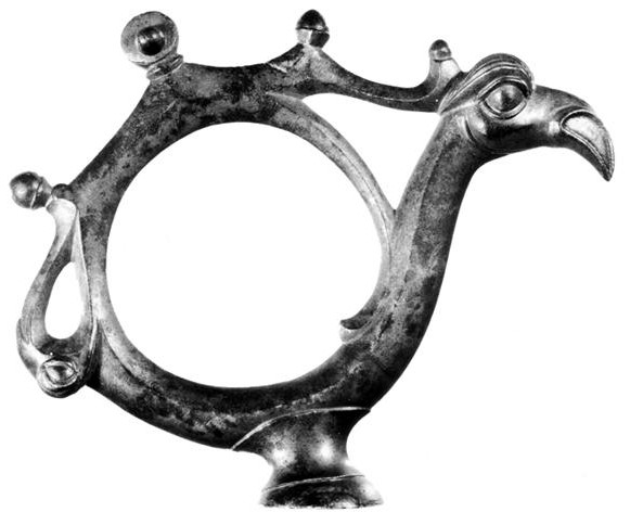 Accesorio de jarra de bronce fundido con asa anular y detalle de cabeza. Yacimiento de Brno (Rep.Checa).