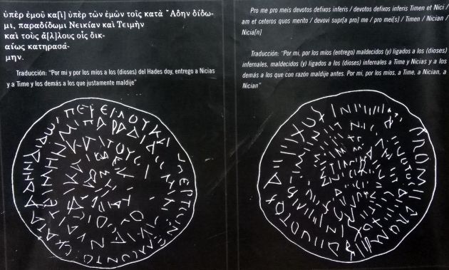 Y para terminar la entrada comentaros que en Barchin del Hoyo (Cuenca) se encontró una defixio escrita en espiral en griego y latin, donde se invoca al dios Hades para maldecir a 3 personas.