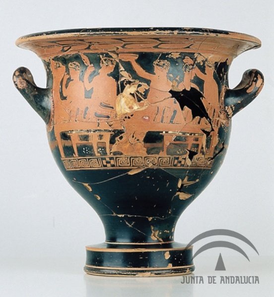 Nos detenemos en ella y comprobamos que, en esta crátera, aparece una de apoteosis formada por seis personajes: en el centro un varón imberbe, desnudo y sedente.Sobre su manto envuelve la cabeza mientras sujeta una vara coronada por dos erotes. Detrás otro varón sedente, desnudo y barbado es acompañado por un joven.
