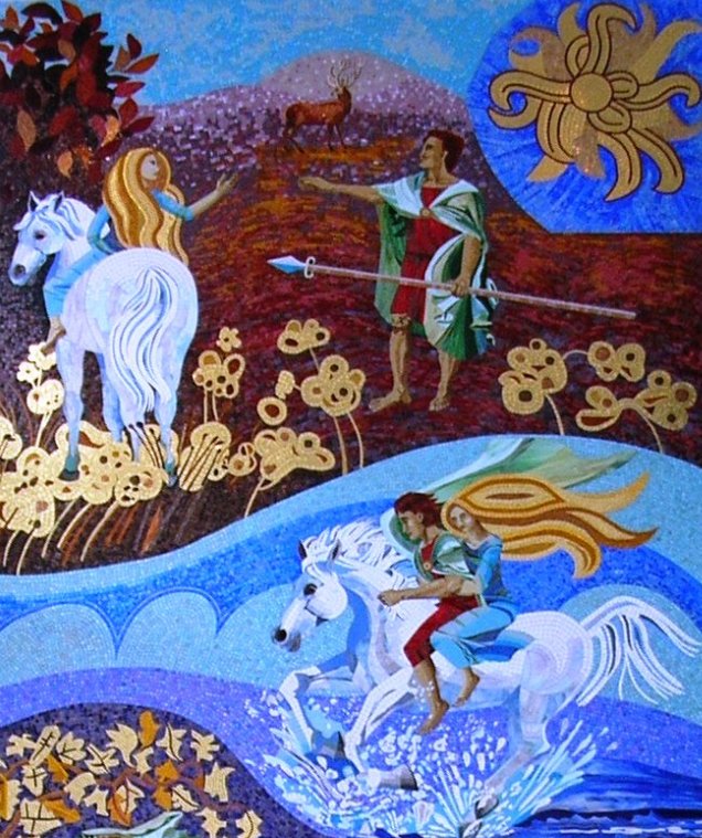 La imagen de la cabecera de esta entrada pertenece al mito de «Oisin y Niamh». También realizado por Desmond Kinney, se encuentra en el Hospital St. James (Dublín). En él se cuenta la historia de cómo Oisin se enamora de Niamh y parten a la Tierra de la Eterna Juventud, o Tír na nÓg.
