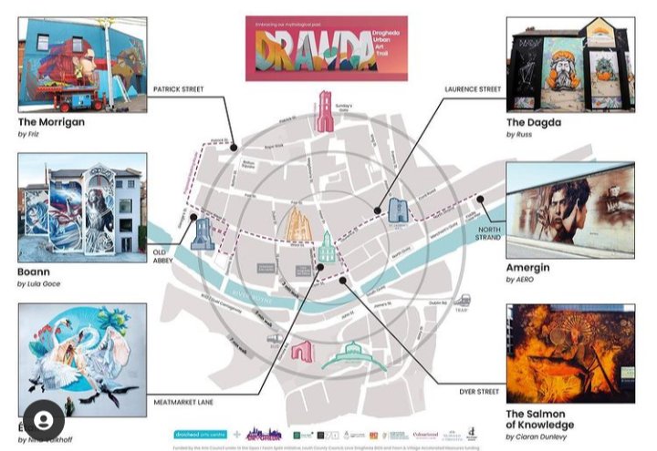 En Drogheda, donde llegaron los Hijos de Mil (o milesios) para conquistar Irlanda, han realizado estos últimos meses seis murales relacionados con la mitología celta, promovidos por la Droichead Arts Center. os dejo el mapa de Droichead, con la ubicación de cada mural por si este verano hacéis una escapa a Irlanda y los queréis ver.