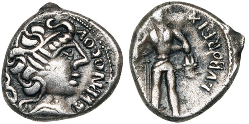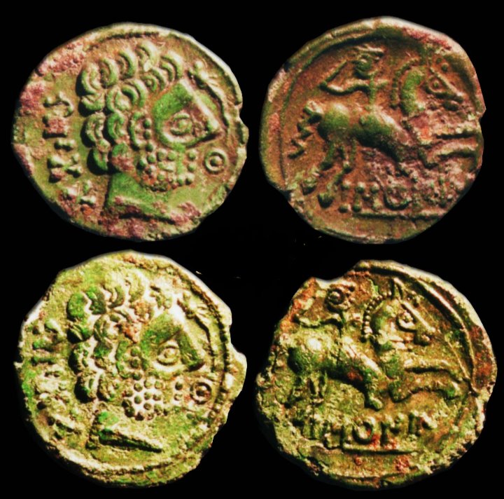 Veamos un par de ejemplos de monedas celtas. Moneda de plata de los eduos (Mont Beauvray, Francia) datada entre los años 60-54 a. C