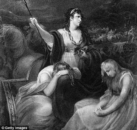 En ella, subida en su carro junto a sus dos hijas, alentaba a su gente recordándoles las vilezas que los romanos habían cometido contra ellos, diciéndoles que podrían ser libres mientras apelaba a los dioses.