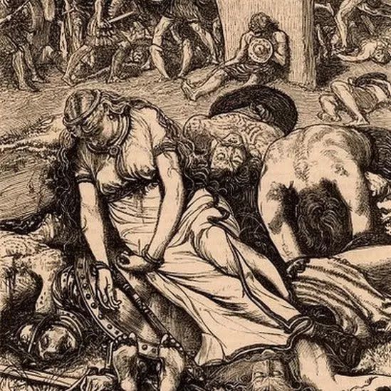 Pero a su muerte, el reino fue atacado por centuriones romanos que no respetaron el acuerdo. Y aquí es donde sale el nombre de Boudicca por primera vez, como víctima de la violencia de los centuriones ya que la azotaron, y sus dos hijas fueron violadas.