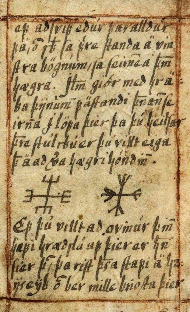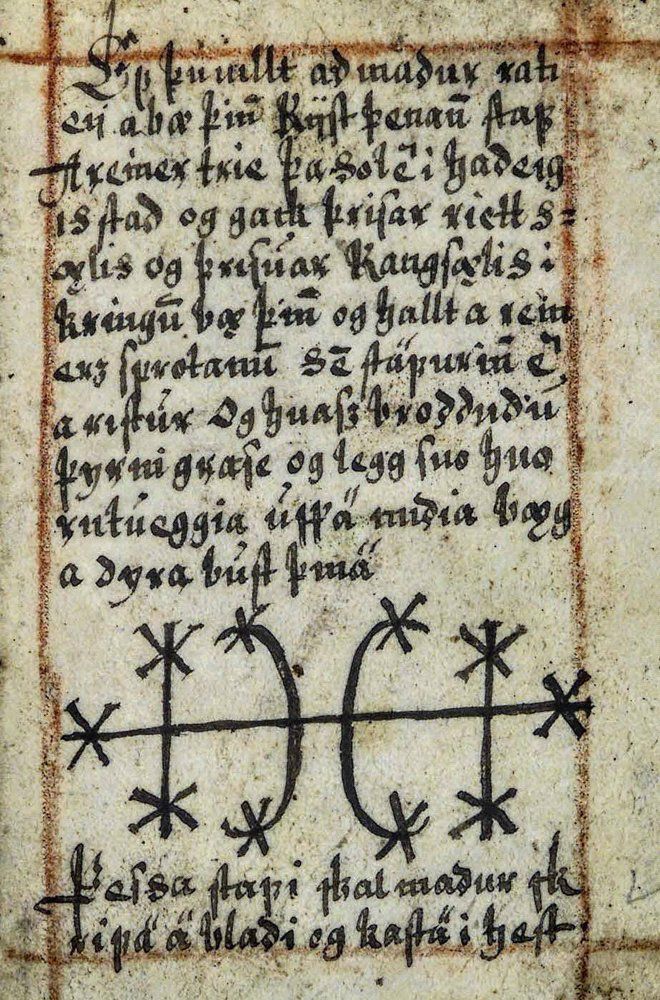 – Para impedir que una persona entre en tu casa: Si no quieres que un hombre venga a tu morada, graba esta runa en madera de serbal cuando el sol esté en su punto más alto, y ve tres veces hacia el sol (riett-saelis) y tres veces contra el sol (ranga-saelis) alrededor de vuestra granja y sujeta la vara de serbal en la que se grabó la runa, y sujetar hierba de espino afilado (cardo) y dejarlo encima de la puerta juntos.