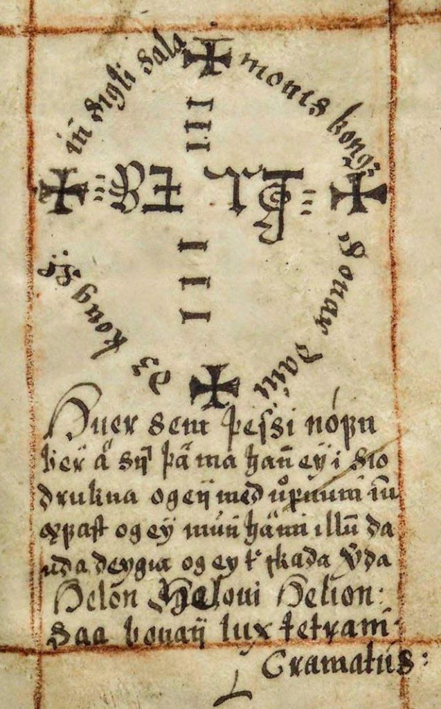 – Contra el odio y el veneno de demonios y enemigos: Quien lleve el siguiente sigilo encima nunca será dañado por cualquiera de las tentaciones del diablo, y si enemigo no será capaz de ejecutar ningún odio activo en su contra. Tampoco será expuesto a ningún veneno en su comida o bebida, y nunca será victima de ninguna acción malvada.