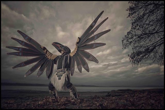 La tribu Tlingit (Canadá y Alaska) creían que el cuervo había dado el fuego al pueblo, y puesto en curso el Sol y la Luna. En las ceremonias rituales utilizaban máscaras que representaban antepasados sobrenaturales y héroes, y utilizaban una carraca tallada en forma de pájaro.