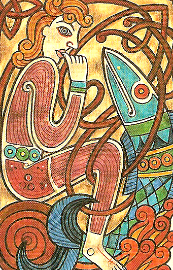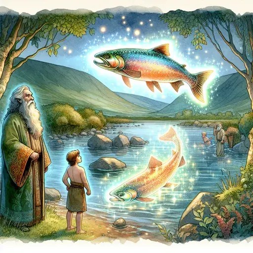 Poco tiempo llevaba el muchacho aprendiendo con el bardo cuando este capturó el salmón. Siete años había esperado aquel momento, y por fin había llegado. Lo cogió nervioso entre sus manos, le advirtió y le hizo prometer al joven que no comiera ni un poquito de él. Confiando en su palabra, se lo dio para que lo cocinara. Al terminar, se lo sirvió a Finnegas y lo puso delante de él sobre la mesa; pero, al mirarle, le pareció ver la luz de la sabiduría en los ojos de Finn. El bardo le preguntó si había comido del salmón, y este lo negó, aunque le contó que, al estar asándolo, quiso darle la vuelta y se quemó los dedos, por lo que se los chupó para aliviar el dolor. Entonces el sabio le dijo que, con ese simple gesto, toda la sabiduría contenida en el salmón le había sido otorgada, y que terminara de comérselo, pues el destino así lo había querido.