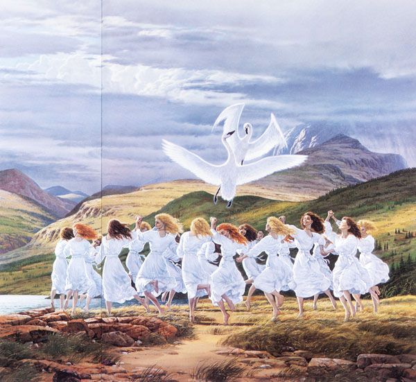 Ella fue hacia él, y él le tendió los brazos. Cuando se encontraron, Oengus se convirtió en cisne, y juntos dieron vueltas sobre el lago y durmieron abrazados. Como no hubo nada deshonroso en sus actos, ella confió en él, y ambos partieron del lago en forma de dos aves blancas que, desde entonces, permanecieron unidas por siempre.