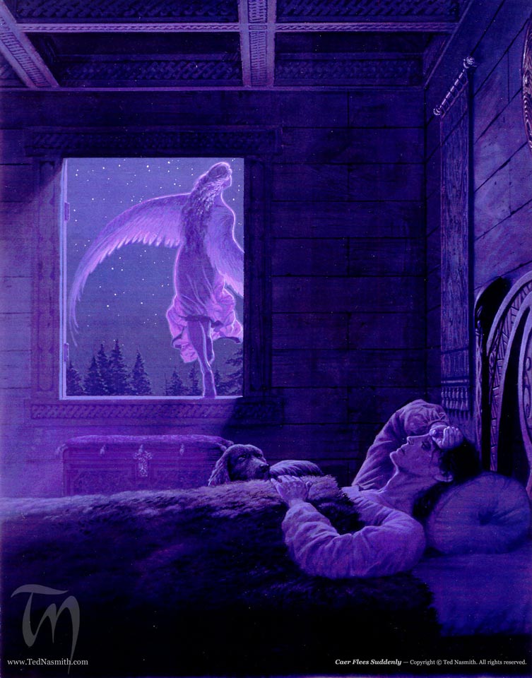 Fueron hasta el lago, y allí estaba ella junto a ciento cincuenta doncellas más. Todas estaban unidas por finas cadenas de plata, y ninguna de ellas le llegaba a la otra más allá del hombro. Entonces Oengus preguntó al rey por su nombre, y este le respondió que se llamaba Caer. También le repitió que no podía hacer nada más por él, pues era hija del rey de las hadas de Connacht, territorio de la reina Maeve y Aillil. Después de aquello, Oengus regresó con su séquito y sus padres a su castillo.