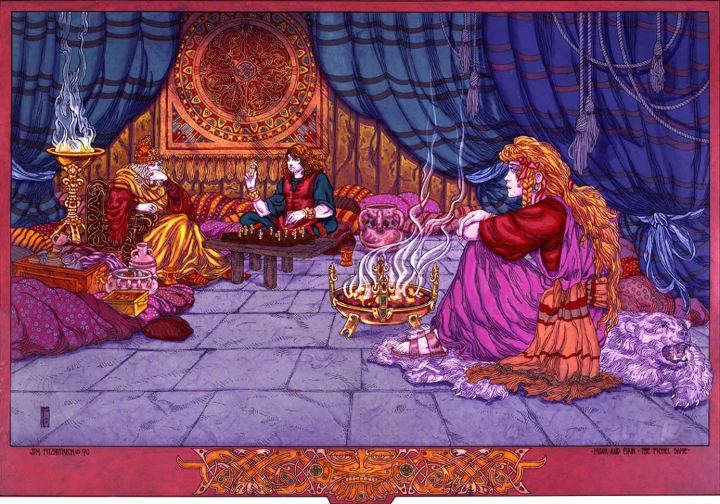 Tiempo después, un día en que el Gran Rey miraba desde la ventana de su palacio, vio cruzar la llanura a un jinete de cabello dorado y capa púrpura. El jinete se detuvo ante él y le propuso jugar una partida de ajedrez. El rey aceptó, y Midir sacó un tablero forrado en oro, con piezas engarzadas de joyas, digno de reyes.